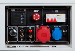 ![]() | Панель управління: інтуїтивно проста, доступна недосвідченому користувачеві. На ній виведені: кнопка запуску генератора, основні індикатори роботи (вольтметр, лiчильник вiдпрацьованого часу (мотогодини)), розетки - 2 шт на 16 ампер, клеми на 12В для зарядки акумуляторiв, АВР - автоматичний регулятор напруги, запобіжник на розетки, заземлення. |