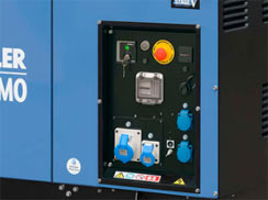 ![]() | Панель управління: інтуїтивно проста, доступна недосвідченому користувачеві. На ній виведені: кнопка запуску генератора, основні показники роботи (лічильник відпрацьованого часу (мотогодини)), розетки - 3 шт. по 16 ампер, 1 розетка на 32 Ампера, запобіжник на розетки, заземлення. |